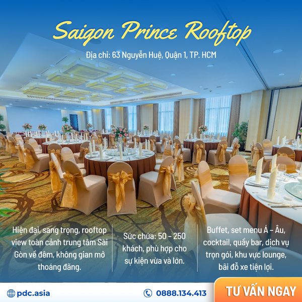Saigon Prince Rooftop là không gian tiệc ngoài trời cao cấp với view toàn cảnh thành phố, phù hợp year-end party, cocktail party hoặc gala dinner sang trọng, đem đến trải nghiệm sang trọng và hiện đại.