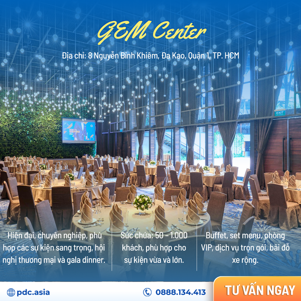 Gem Center là một trong những địa điểm tổ chức sự kiện lớn nhất tại TP.HCM. Trung tâm sở hữu hệ thống phòng hội nghị, phòng họp, sảnh tiệc đa dạng với sức chứa từ 50 đến 2.500 khách. Gem Center được trang bị hệ thống âm thanh, ánh sáng hiện đại, cùng đội ngũ nhân viên chuyên nghiệp, sẵn sàng đáp ứng mọi yêu cầu của khách hàng.