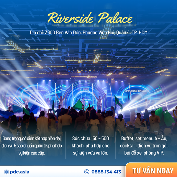 Riverside Palace là không gian tiệc sang trọng ven sông, lý tưởng cho gala dinner, tiệc cưới hoặc sự kiện doanh nghiệp quy mô lớn. Không gian mở, view sông thoáng mát cùng dịch vụ chuyên nghiệp giúp chương trình diễn ra trọn vẹn từ setup đến thực hiện.